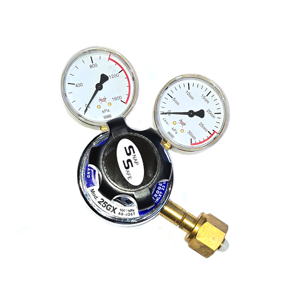 Model 825 Nitrogen Regulator 1000kpa outlet, side inlet with type50 spigot for Nitrogen bottle use. Features Stainless Steel diaphragm, SRV. Complies to AS4267.