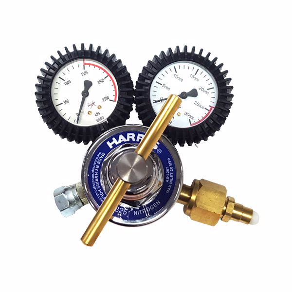 Model 825 Nitrogen Regulator 1500kpa outlet, side inlet with type50 spigot for Nitrogen bottle use. Features Stainless Steel diaphragm, SRV. Complies to AS4267.