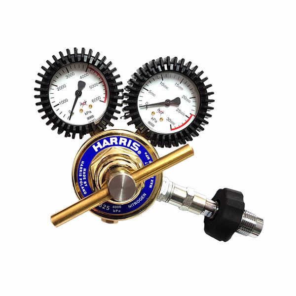 Model 825 Compressed AIR Regulator 4000kpa outlet, side inlet with spigot DIN Bottle connector (not Nitrogen, or Air for Nitrogen see Part No. HARRIS 40BAR-NIT OR for Air see Part No. HARRIS 40BAR-AIR). Features Stainless Steel diaphragm, SRV. Complies to AS4267.