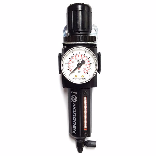 Norgren 1/2" BSP Professional Metal Bowl Filter & Pressure Regulator (FR) Assembly complete with pressure gauge and quick fit wall mounting bracket.