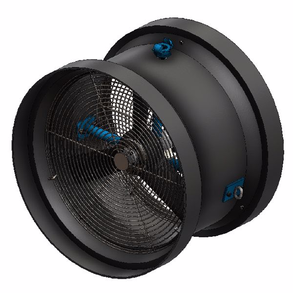 Two hanging points are provided so that the fan can easily be mounted with chain or straps from a roof. The air inlet is a standard Type A snap coupling style.