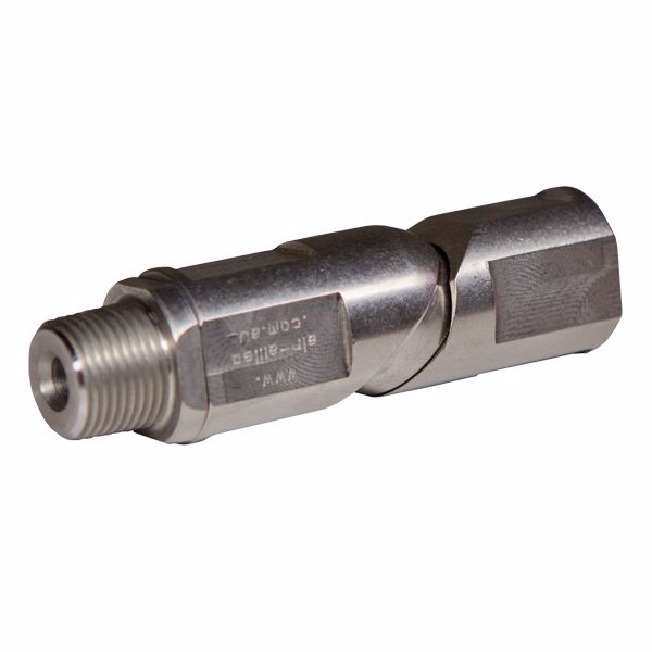 1/4" Multi-Directional Stainless Steel Pneumatic swivel fitting with a 6mm id bore for air flow is unique in many ways. Suitable for underground mining and hazardous environments. Nothing comes close to the flexibility this swivel provides, plus is does not restrict the air flow to the tool. This is achieved through its linear flow design which eliminates and sharp angles inside the swivel.