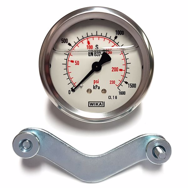 Pressure Gauge Zero to 230 PSI (1600 kPa) liquid filled complete with mounting bracket and 1/4" male BSPT rear entry thread. Suitable for use with silicone based brake fluid and other liquids or gases for testing of pressures.